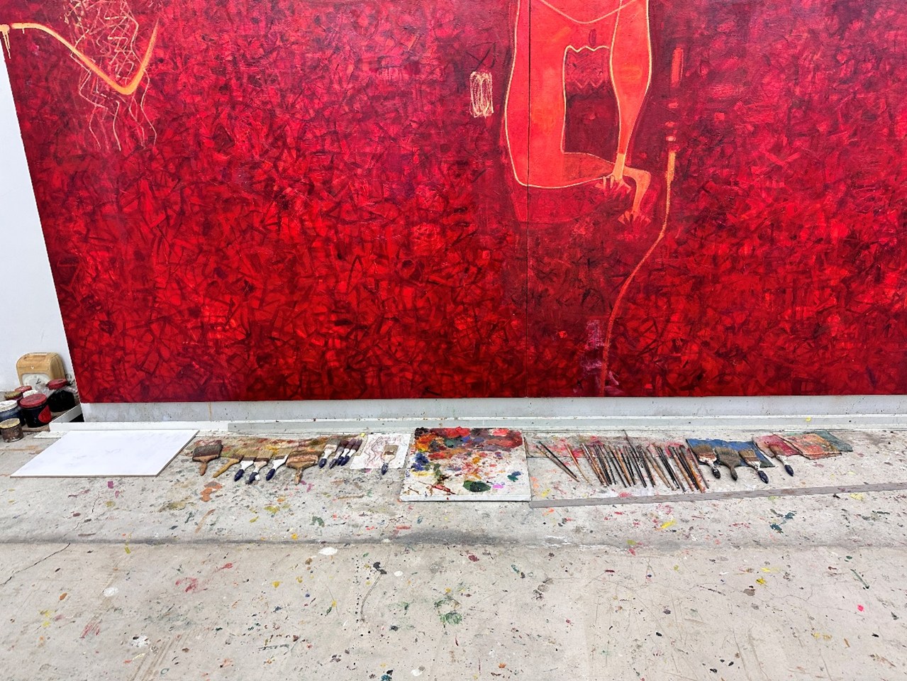 正在創作的畫作前面地上有一長排大大小小的畫筆刷子