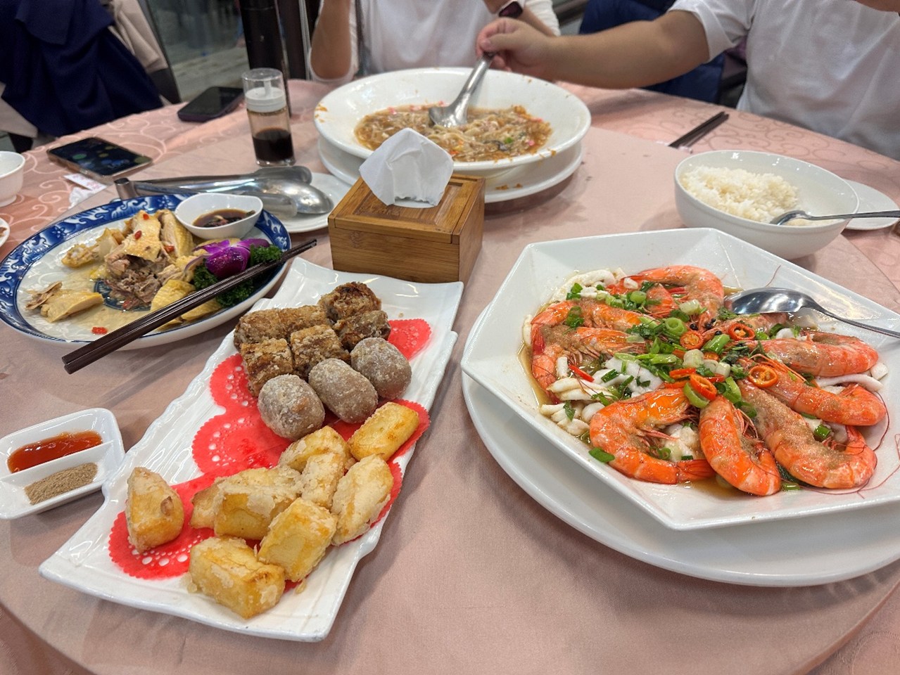 晚餐,最後學長帶我們去吃一家宜蘭最好吃、口味最道地的餐廳-「吉祥客棧」,座落在田間,裡面的菜很特別也很好吃,有蘭陽三味(肉捲、糕渣、芋棗酥三拼-國宴三寶)、西魯肉海鮮羹(辦桌菜),其他菜像鹽焗大蝦、白斬雞都很好吃,還有炒自家種的花椰菜很鮮。