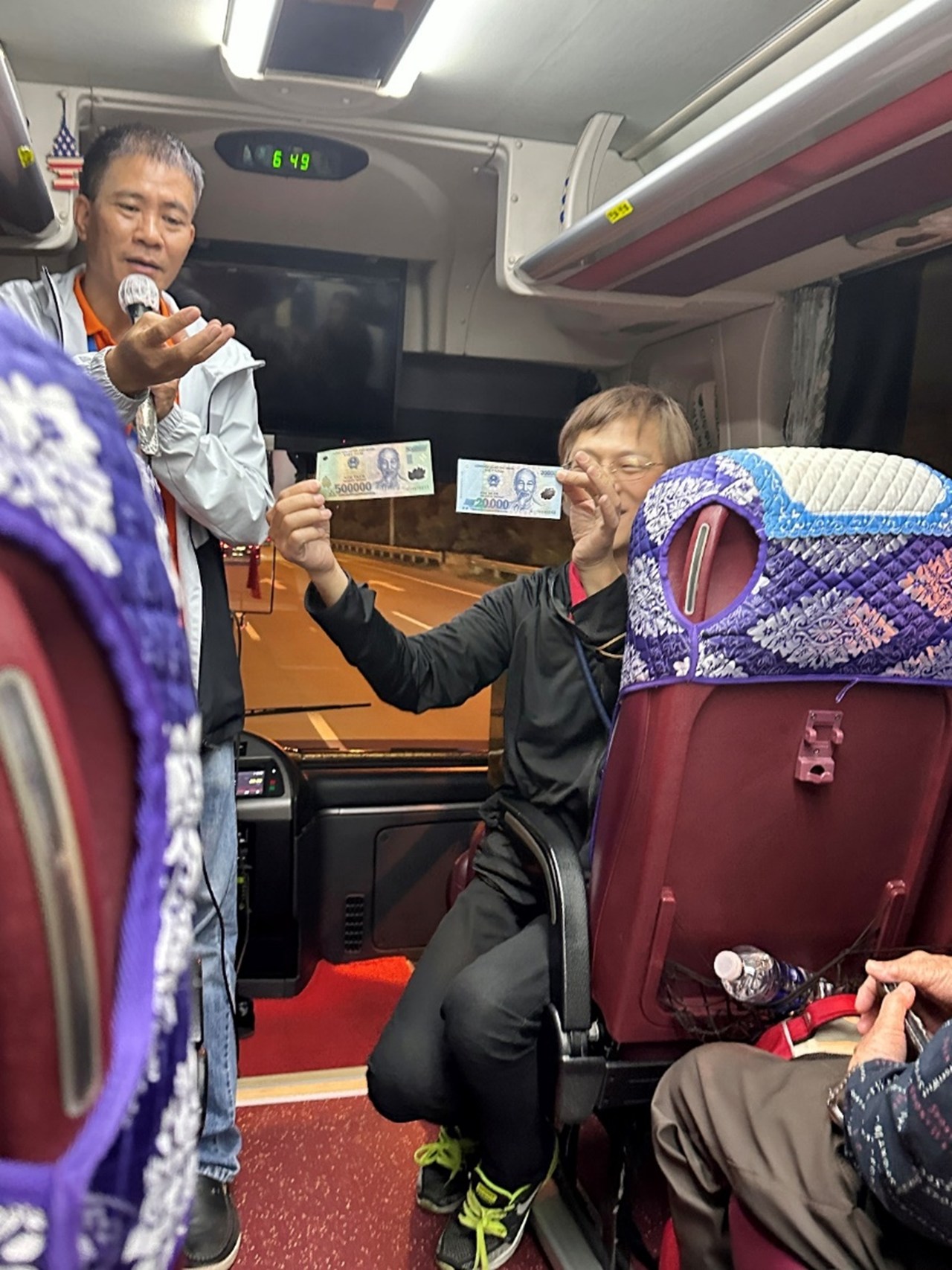 左邊是地陪范線,右邊是小張領隊。因為越南盾的20,000元與500,000元鈔票長的一樣,擔心我們拿錯,於是秀給大家參考