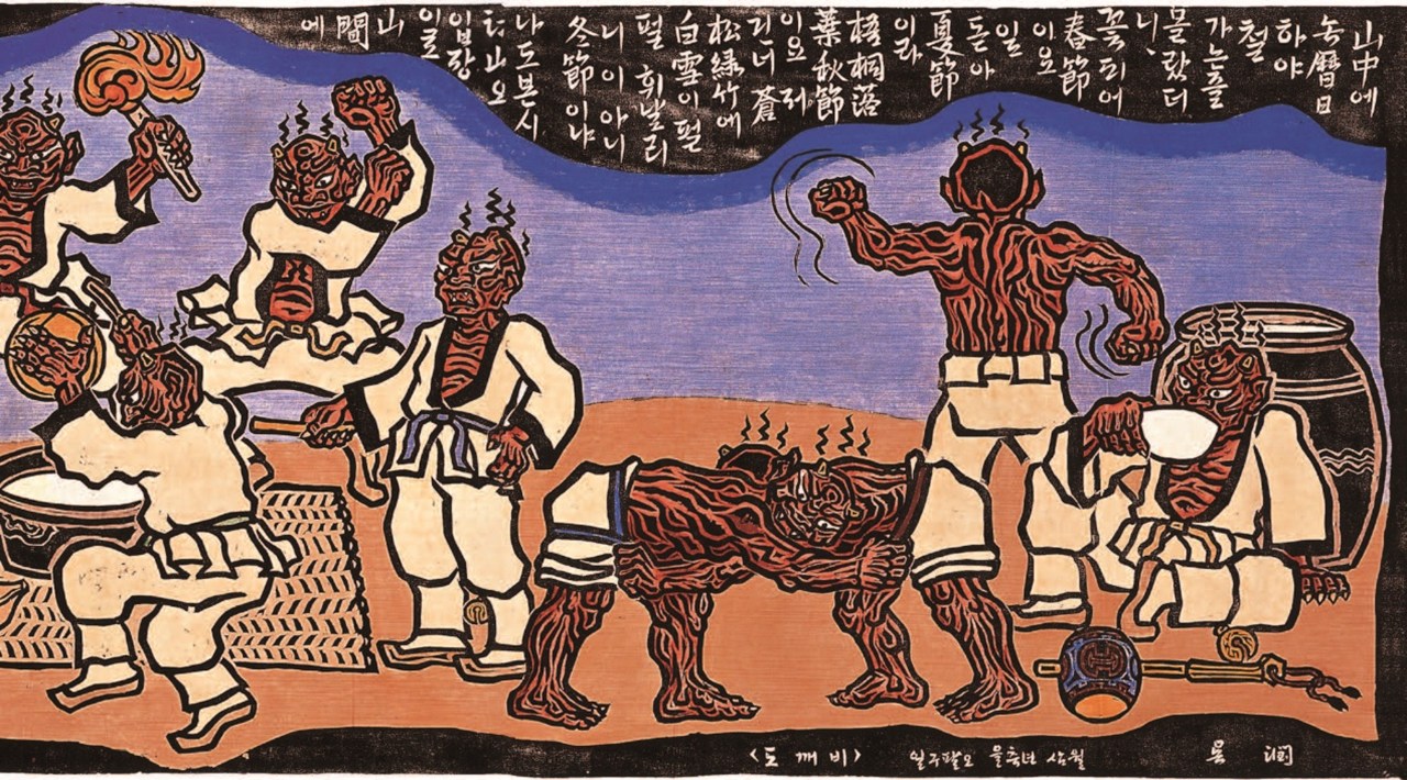 再看看藝術的例子:朴生光(Park Saeng-gwang)如符籙般的巫師畫、吳潤(Oh Yoon)詼諧幽默的鬼怪圖、閔正基(Min Joung-Ki)筆下奇異的金剛山圖(Mount Geumgang)——這些都在呼喚某種「恐懼/敬畏」的感性。