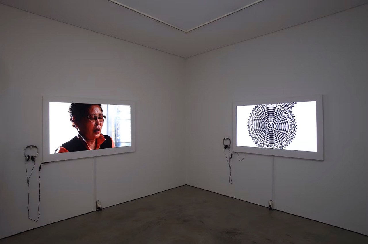 朴贊景《新都內》六頻道錄像裝置,左為〈詠歌舞道〉,右側〈侍天主〉。